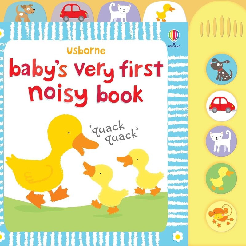 The words are onomatopoeic, providing easy prompts for parents to make sounds for their babies to hear, essential for their speech development along with the sound panel for added effect.