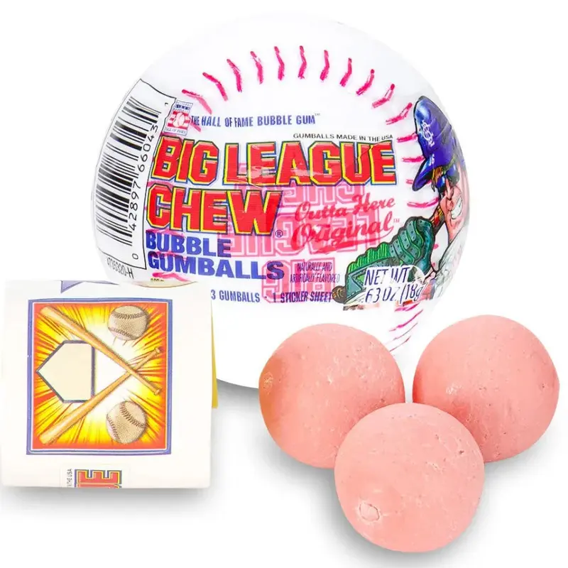 The perfect party favor for the baseball fan! This plastic baseball is filled with three individually wrapped Big League Chew Outta' Here original gumballs, and one sticker sheet.
