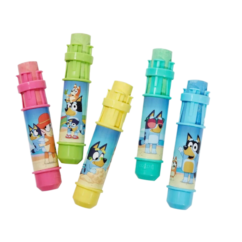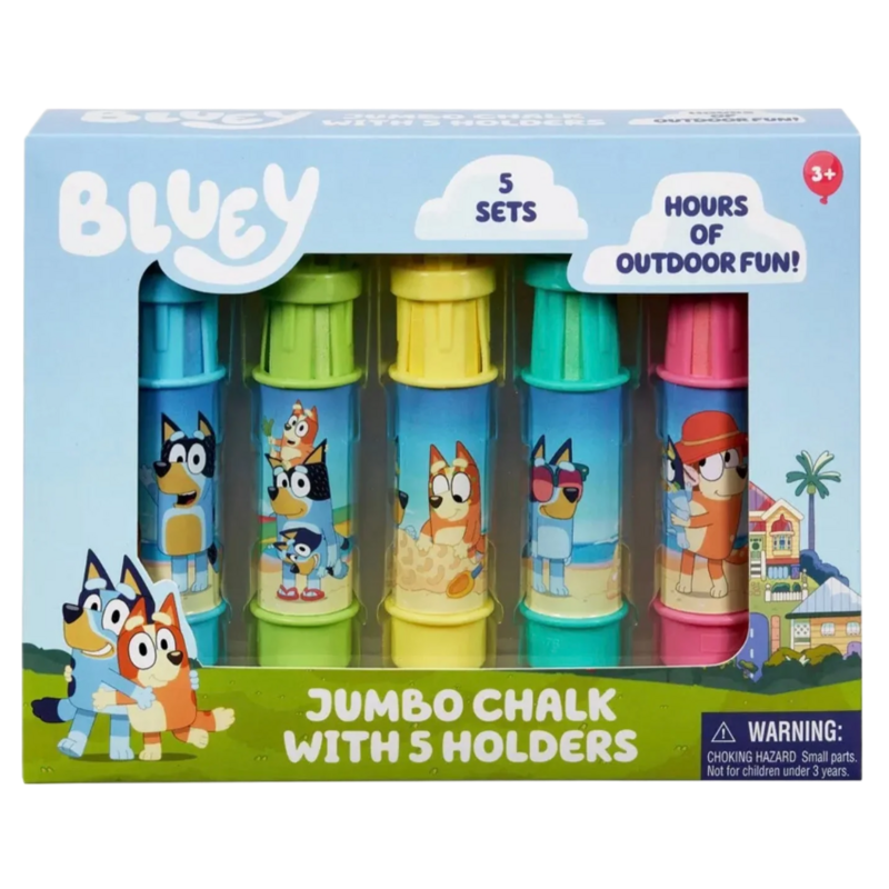 Bluey Jumbo Chalk set includes 5 bluey themed chalk holders and 5 pieces of chalk. Perfectly sized for little hands Ages 3 years+