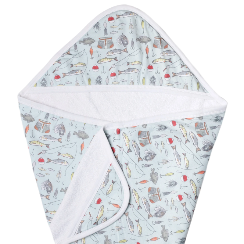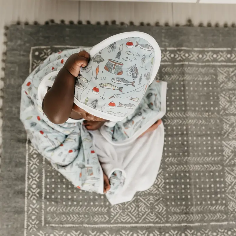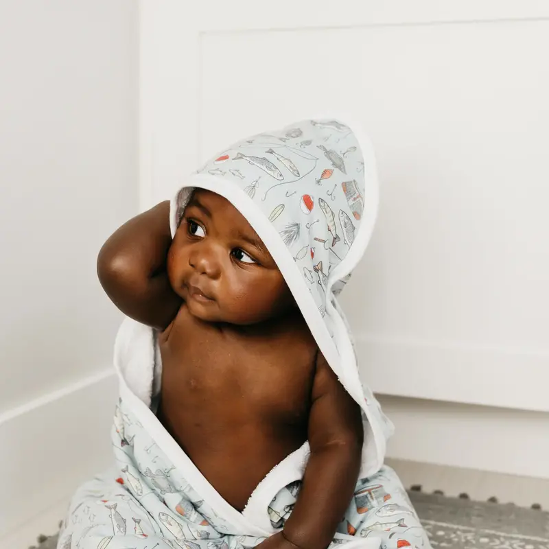Towel is 33x33 inches---perfect for baby's first bath all the way through the toddler years.