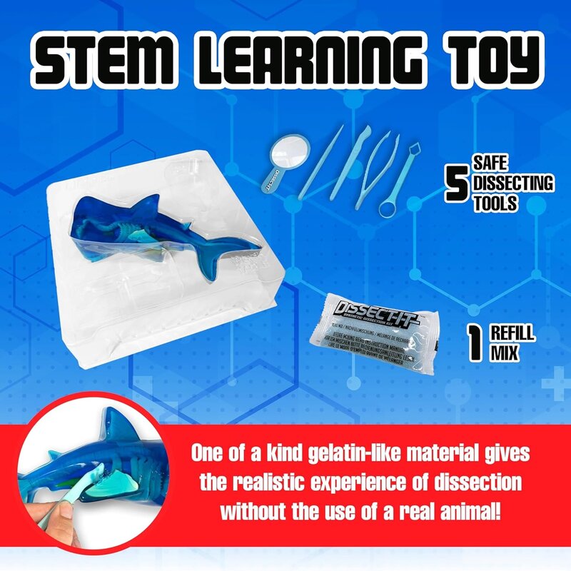 Dive into STEM fun! Kids safely dissect a gel shark to reveal a detailed 40-piece skeleton, lifelike organs, and a mystery animal surprise. Includes tools, refill mix, and a full-color guide—STEM-authenticated for ages 6+.