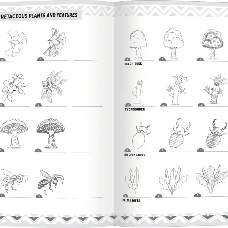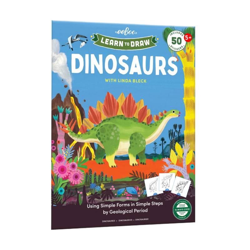 Learn to draw dinosaurs step by step, organized by geological period. Each section ends with a two-page prehistoric landscape to fill in. 32 pages of instruction, a fold-out page of 50 colorful stickers. Suitable for ages 5+.