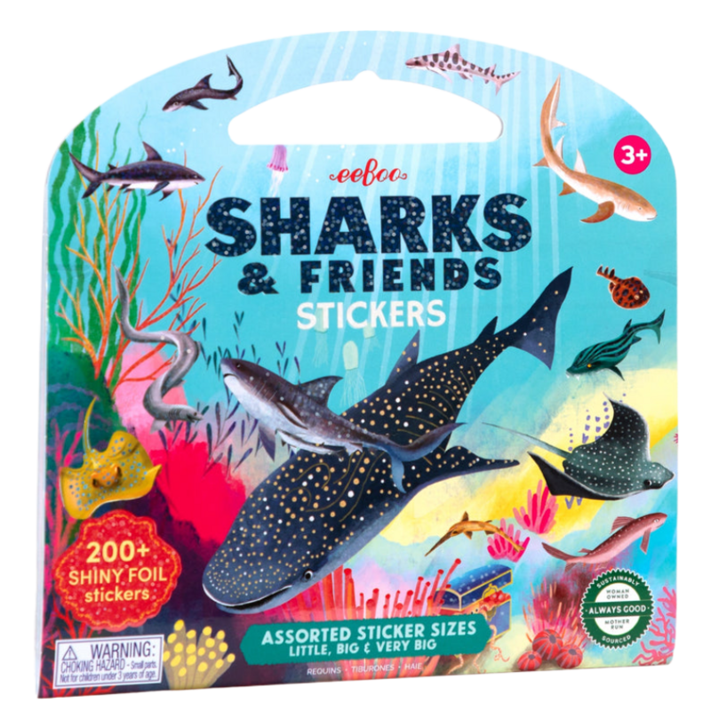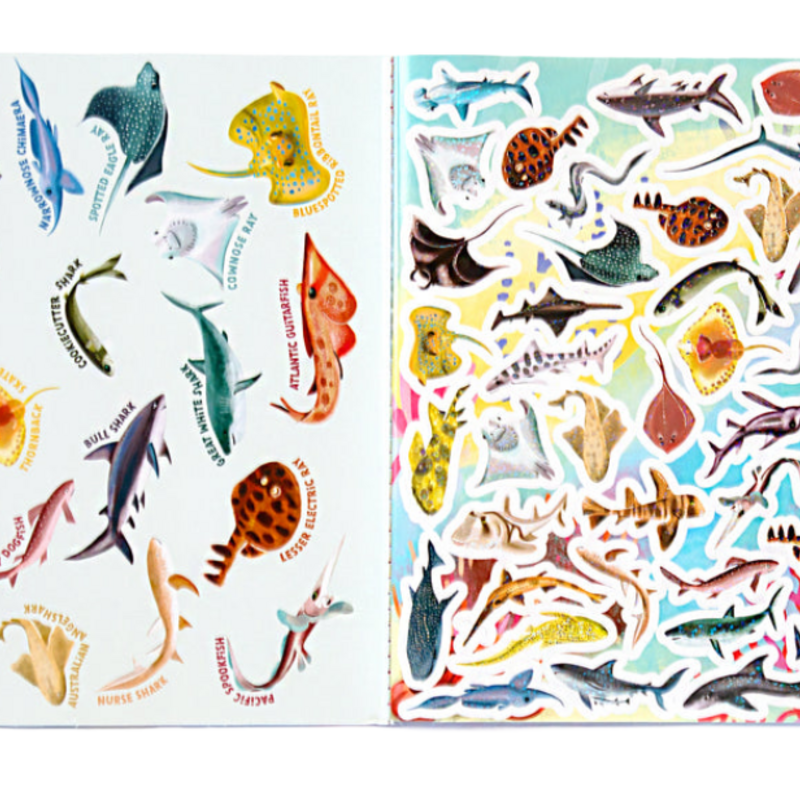 Includes 12 pages of over 200 shiny stickers in three different sizes; 8” x 8” sticker book has die-cut handle for on-the-go fun; Sharks are identified on sticker sheet. Age 3+