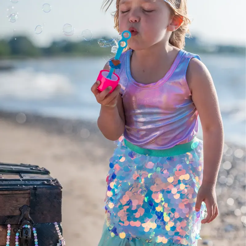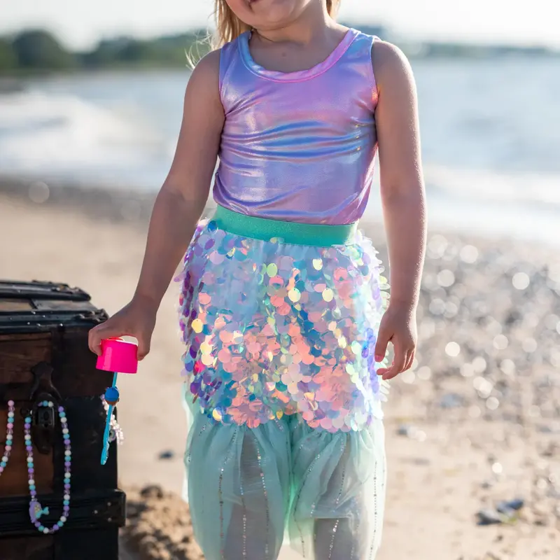 Make a splash with this dazzling mermaid set! The skirt features shimmering large sequins, soft teal tulle for an underwater-inspired look, and a comfortable teal waistband for easy wear.