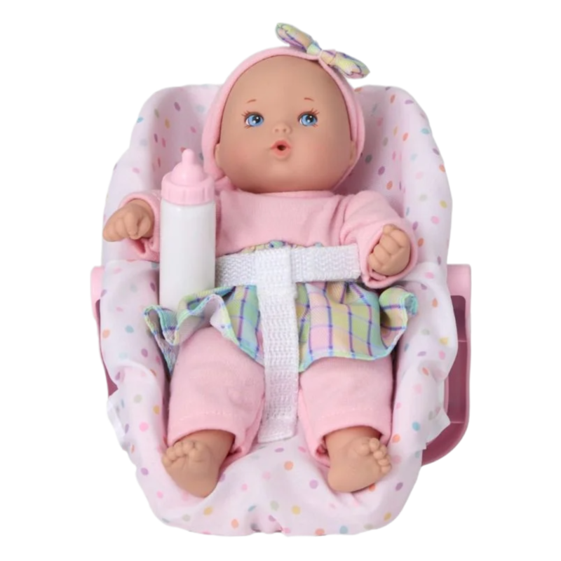 These 8-inch pals are perfect for any adventure, fitting easily in your pocket or backpack. On the Go Little Cutie comes with her own car seat for road trips and and travel. Dressed in a Pink Peplum top with bright plaid accents & matching headband.