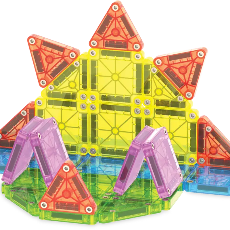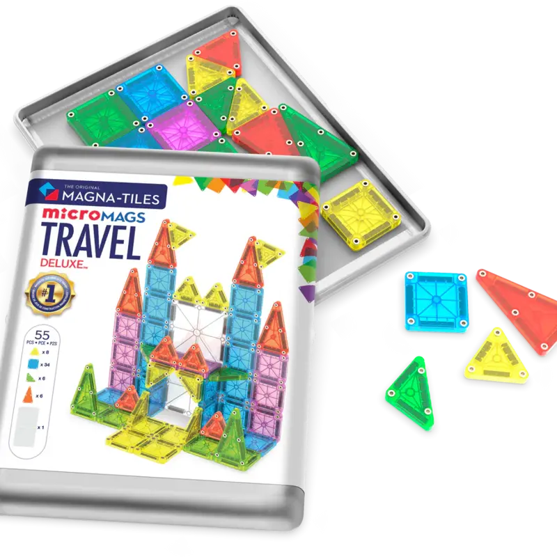 26 microMAGS magnetic tiles, including: 4 Right Triangles, 4 Isosceles Triangles, 6 Equilateral Triangles, 12 Squares. The metal tin packaging provides both convenient storage and baseplate for builds on the go.