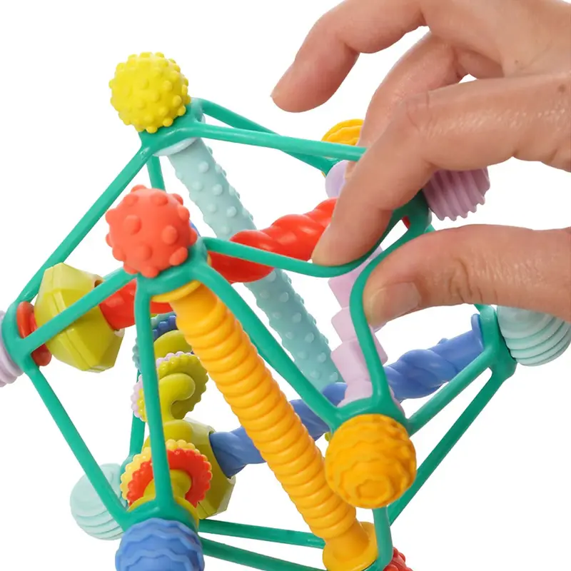 Shake, squish, swirl! Beads spin down plastic rods connected by flexible cording. Textured nubs make this the ultimate squishing and teething toy!