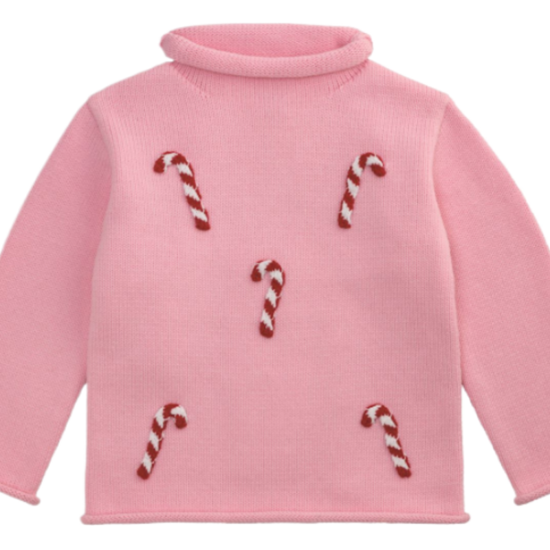 Cotton yarn rolled neck sweater with mini crochet yarn candy canes.