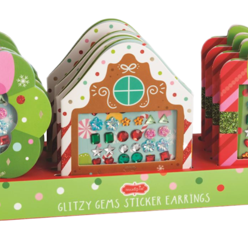 36 pairs of stick-on jeweled earrings come on tri-fold display card with kid safe vinyl mirror. Ages 3+