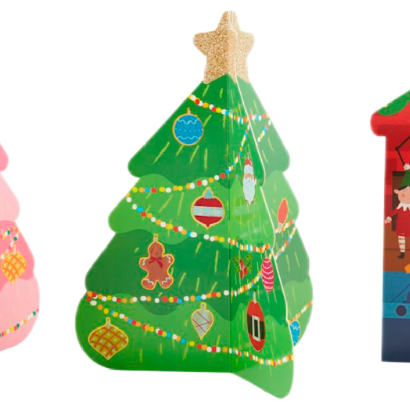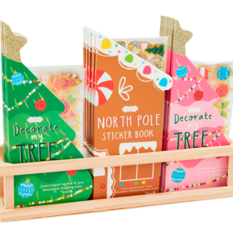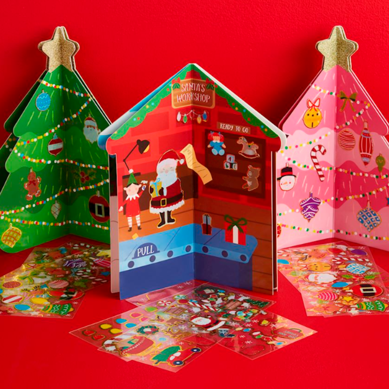 Decorate dimensional folding Christmas tree or gingerbread house booklet with included stickers. Ages 3+