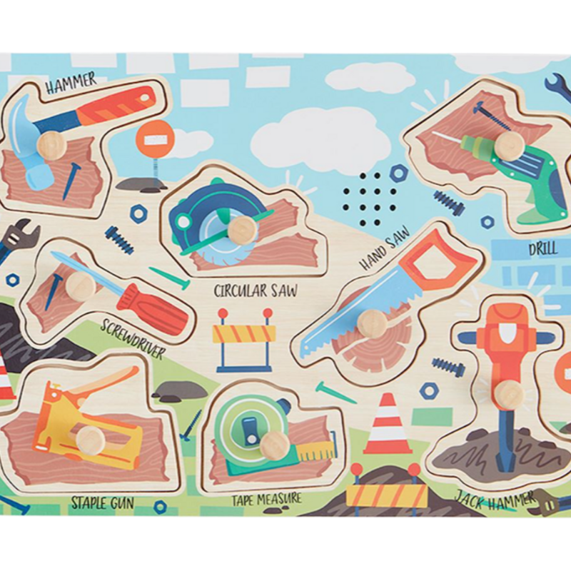 Wooden peg puzzle with interactive sound effects! Correctly place a puzzle piece on board to hear coordinating sound. Requires 2 AA batteries, not included.