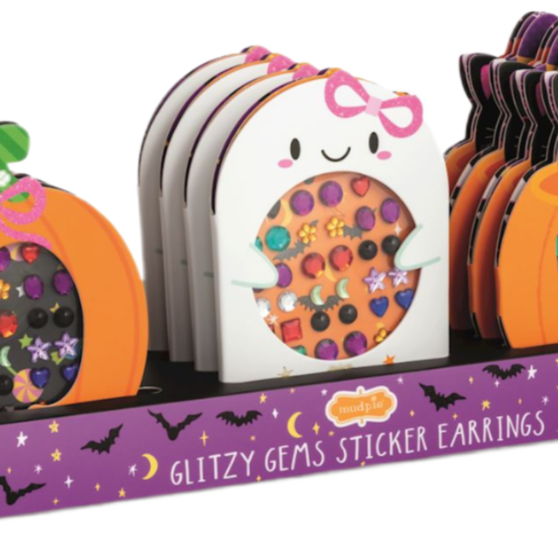 36 pairs of stick-on jeweled earrings come on tri-fold display card with kid safe vinyl mirror. Ages 3+