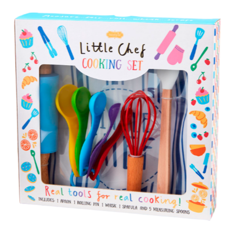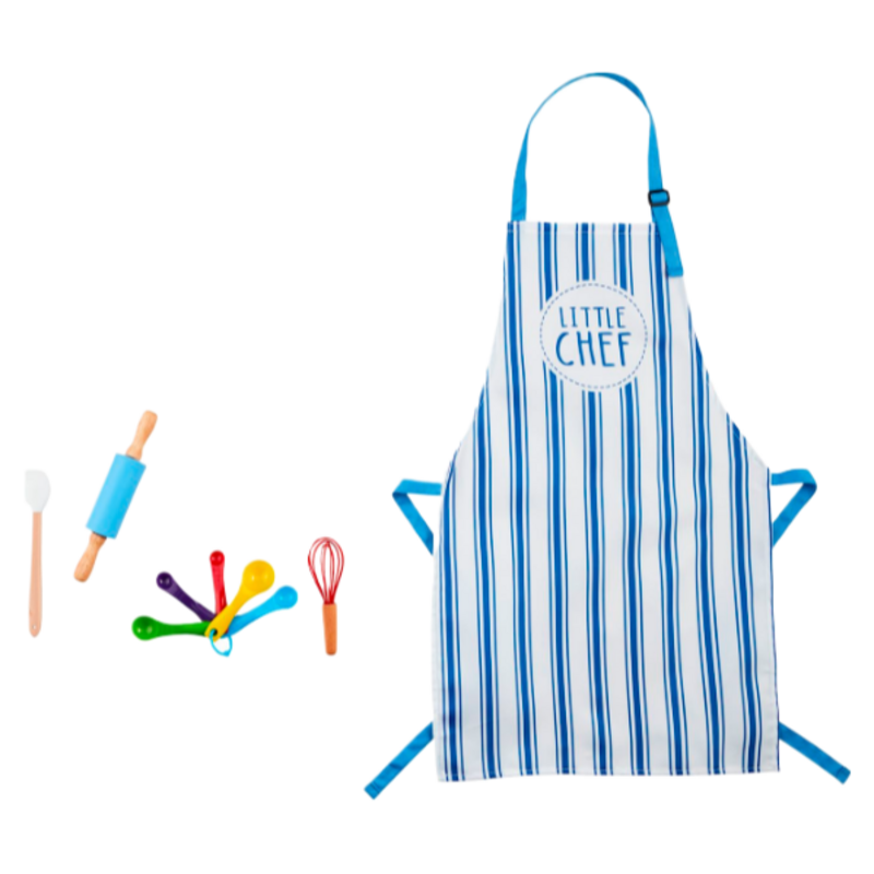 Real tools for real cooking! Set includes: child sized apron, rolling pin, whisk, spatula and set of five measuring spoons. Ages 3+.