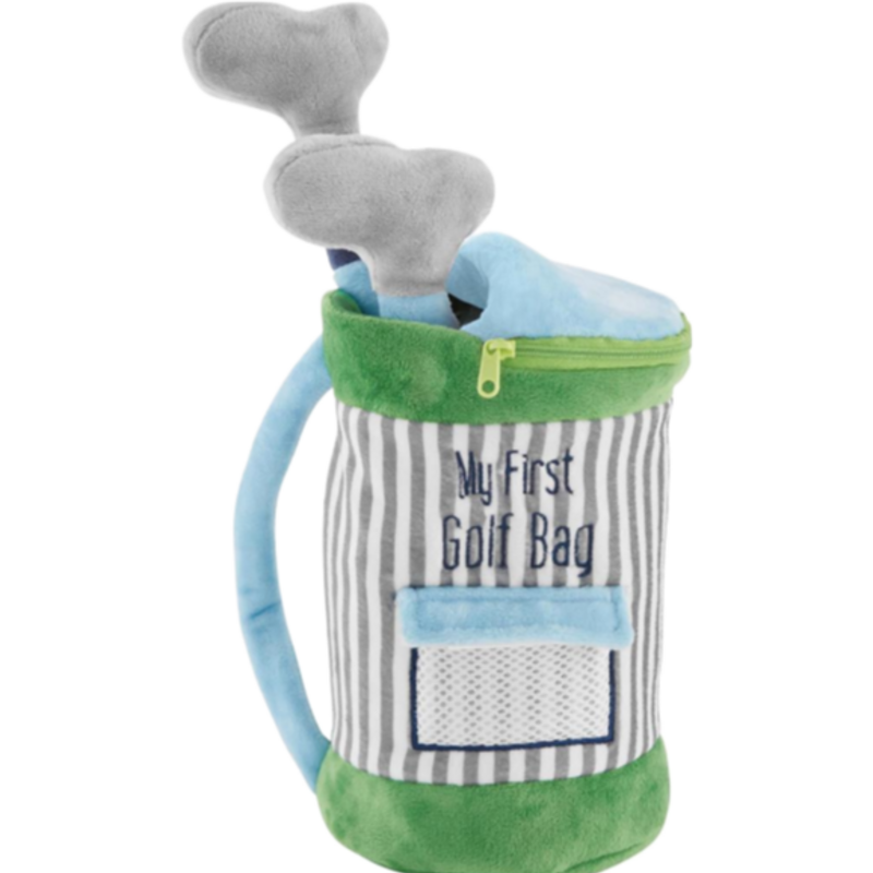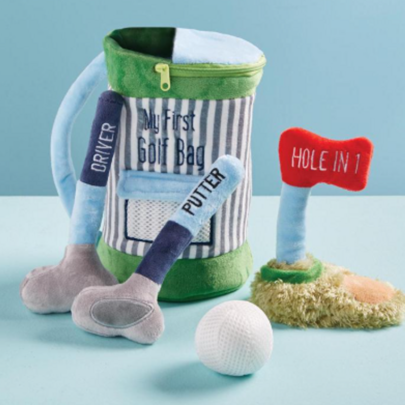 5-piece set. Interactive so-soft plush golf bag holds plush golf ball, driver, putter and putting green with kid friendly crinkle and rattle noises for hours of imaginary play. Ages 18M+
