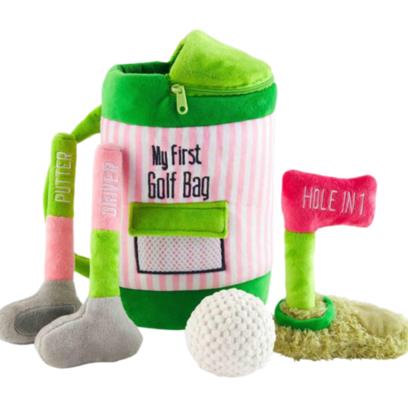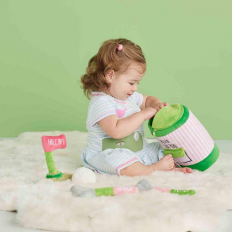 5-piece set. Interactive so-soft plush golf bag holds plush golf ball, driver, putter and putting green with kid friendly crinkle and rattle noises for hours of imaginary play. Ages 18M+