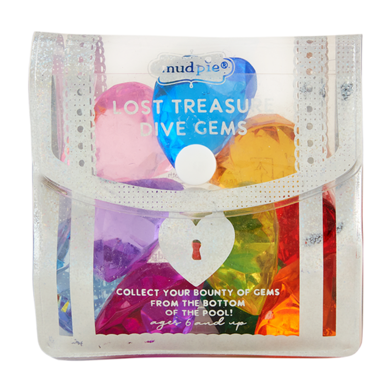 10 plastic gems for underwater play Gold sparkly finish adds elegance Comes in a vinyl treasure box storage bag Perfect for ages 6 and up