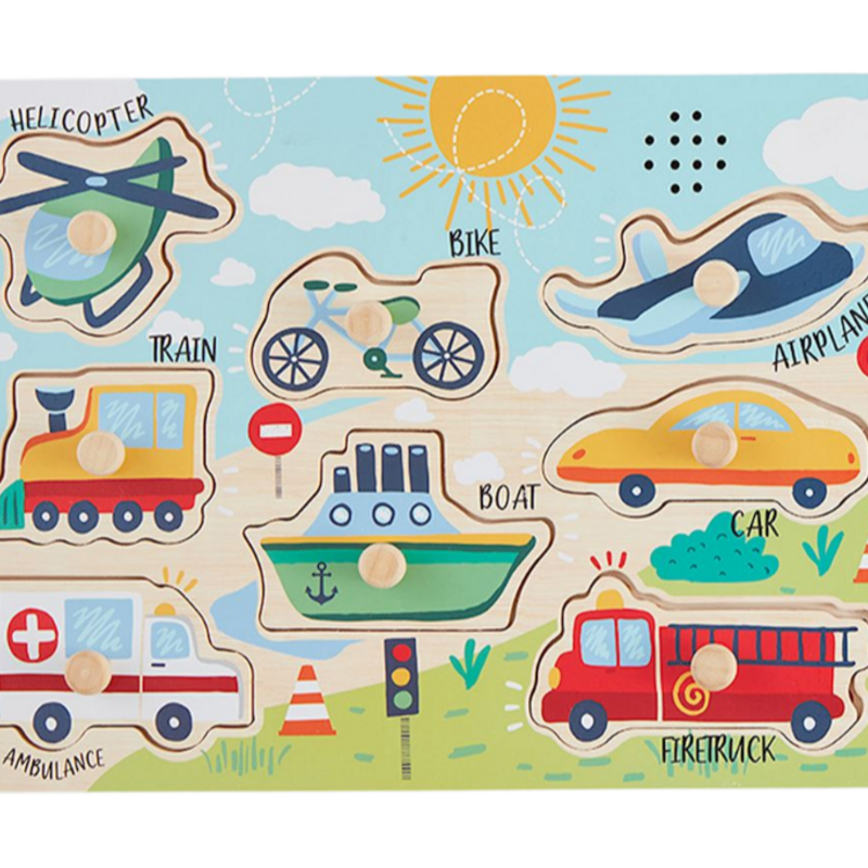 Wooden peg puzzle with interactive sound effects! Correctly place a puzzle piece on board to hear coordinating sound. Requires 2 AA batteries, not included.