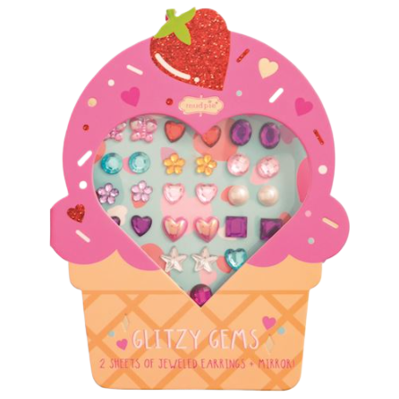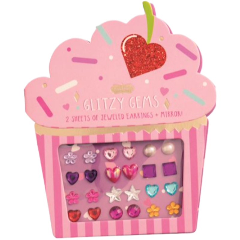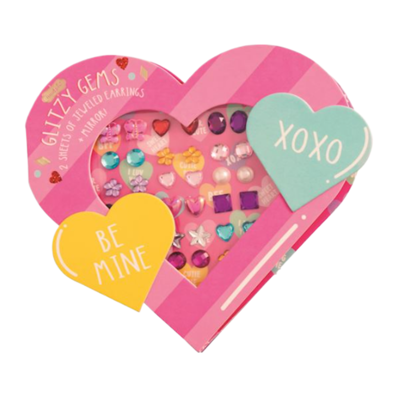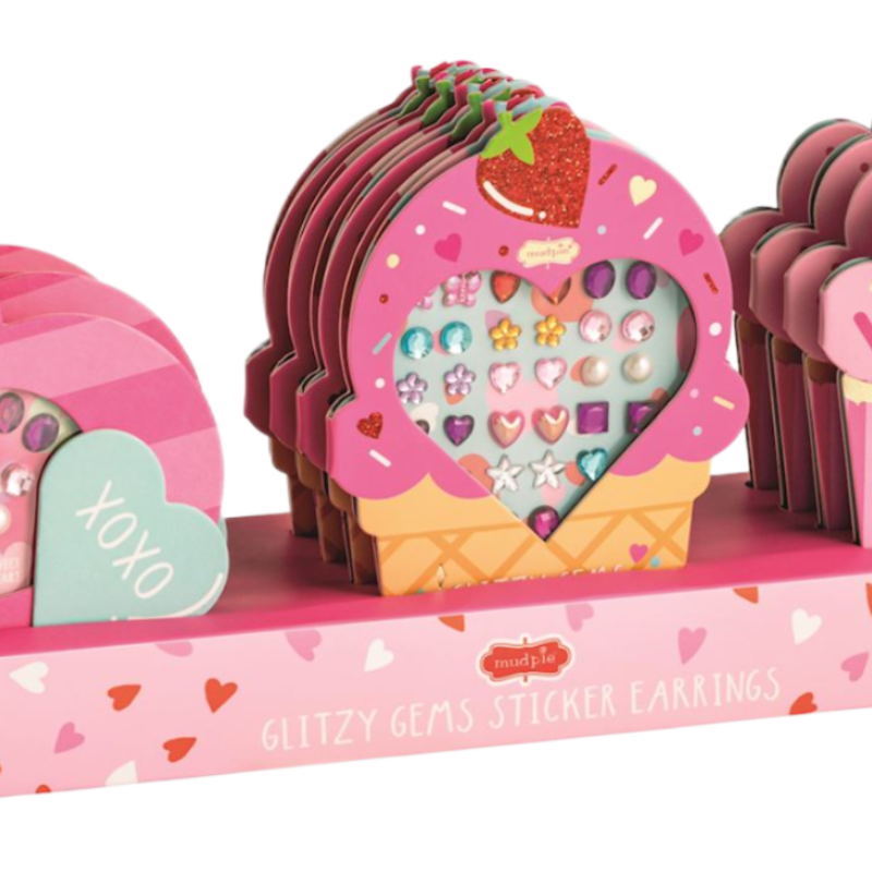 Two sheets of stick-on jewel earrings come in a folded display card with vinyl mirror. Ages 3+.