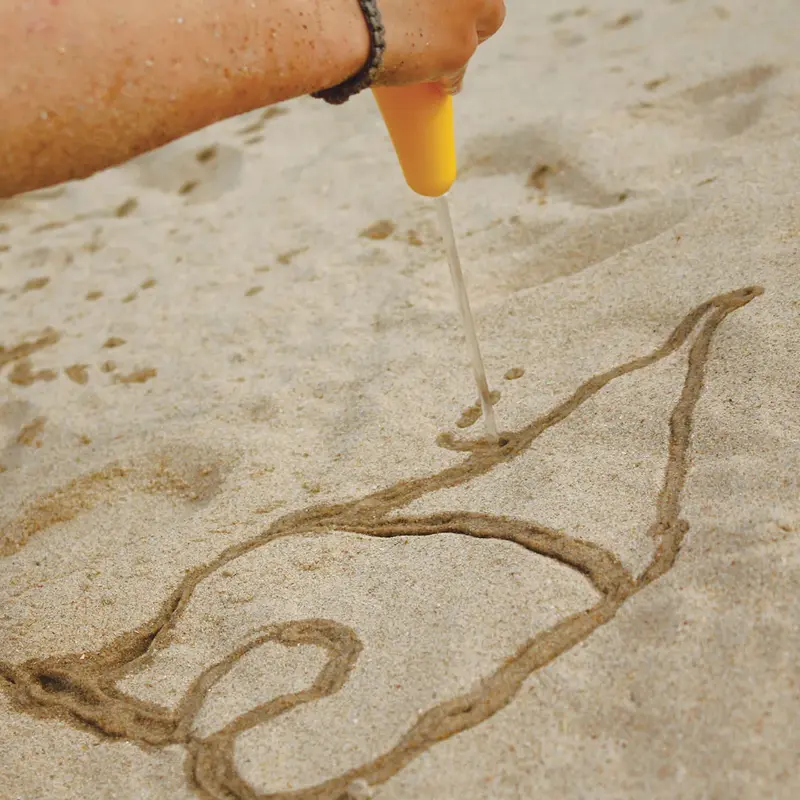 Use the shovel to scoop out sand and make tracks for rolling the ball or use the uniquely designed hole to write or make patterns with sand and water.