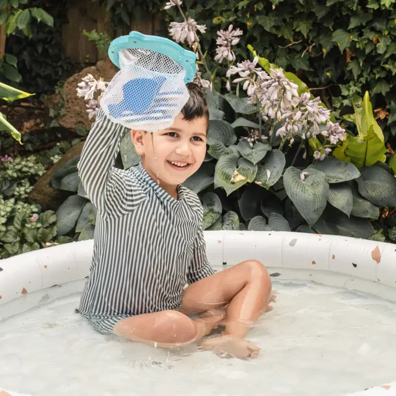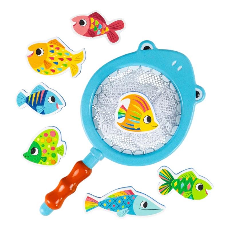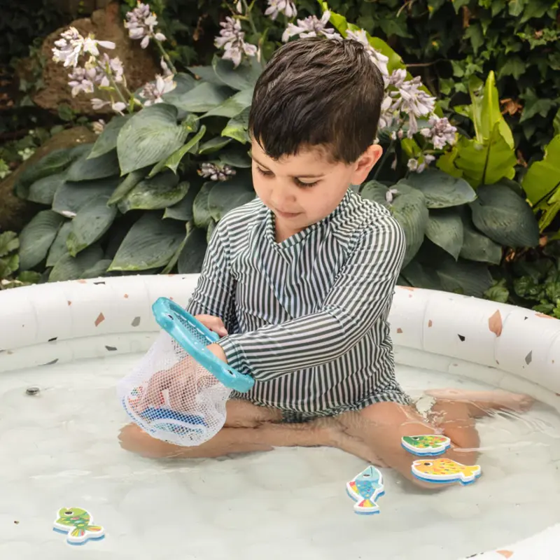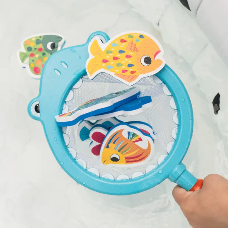 A fun bath toy for ages 1–3, Shark Chasey lets toddlers scoop, catch and collect 7 foam fish with a shark net. Fish float or stick to the tub for counting and color sorting, helping build grip strength and coordination. Made from eco-friendly bioplastic.