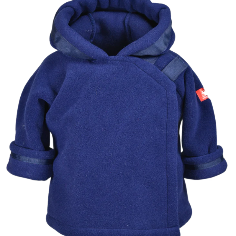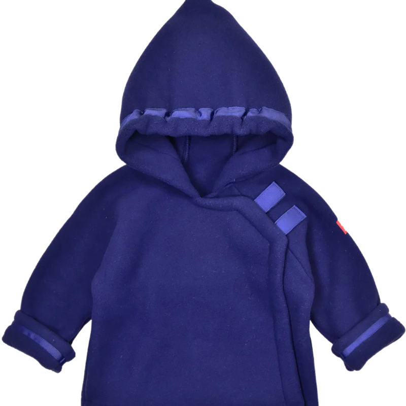 - Hood with grosgrain trim, straight neck, long sleeves with grosgrain-trimmed cuffs