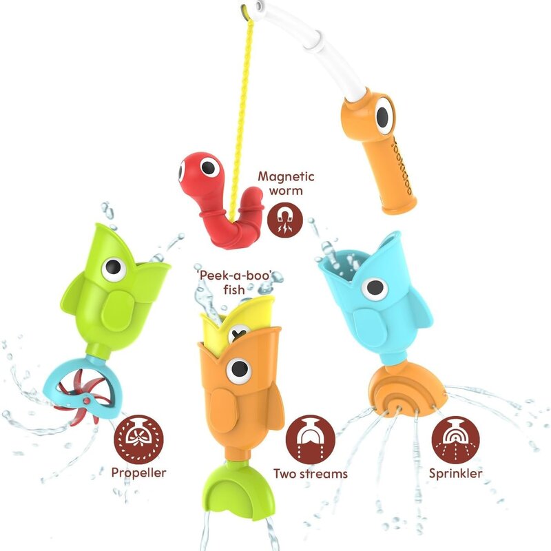 A garden theme bath toy- a flower pot with a worm and a flower that hides a bumble bee inside it. Use the watering can to water the flower and set off a chain reaction of fun!